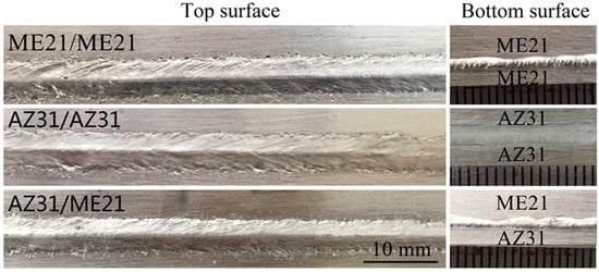 As shown in Figure 2, the welds exhibited uniform and beautiful appearances in the same condition. The morphology of the top and bottom surface of the ME21/ME21, AZ31/AZ31, and ME21/ME21 joints were different. The ME21/ME21 welding width of the bottom surface was significantly smaller than that of the AZ31/AZ31 joints. Studies have shown that the thermal conductivity of the cast samples for Mg–0.5Mn–0.15Ce and Mg–0.5Mn–0.6Ce at room temperature were 138.2 W/(m·K) and 129.9 W/(m·K), respectively, and the thermal conductivity of the AZ31 alloy is 76.9 W/(m·K) [28,29]. Wang et al. pointed out that the thermal conductivity of the Mg–(1.5–2.5)Mn–(0.15–0.35)Ce alloy is 134 W/(m·K) at 100 °C [30]. The signs suggest that the thermal conductivity of ME21 alloy is higher than that of the AZ31 alloy. Compared with the AZ31 alloy, the larger the thermal conductivity of the ME21 alloy, the more narrow the welding seam width that will be gained. It could be seen that the stability of the weld shape of same metal is superior to that of a dissimilar metal.