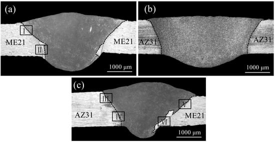 Micrographs of the joint cross-sections (a) ME21/ME21 joint; (b) AZ31/AZ31 joint; (c) ME21/AZ31 joint.