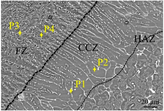 EPMA was used to observe the microstructure of the weld seam and columnar crystal, and Figure 6 shows the microstructures of the ME21/AZ31 joint. Coarse columnar crystals are clearly visible, and many white bright phases are found to precipitate along the grain boundaries in the CCZ. Many fine particles precipitate along the grain boundaries in the FZ as well. The precipitate phases distribute in CCZ continuously and distribute in FZ dispersively. The results of EPMA-Energy Dispersion Spectrum (EDS) analysis of the microstructure are shown in Table 1. EPMA–EDS analysis indicated that P1 and P2 in the CCZ contain Mg95Ce3Mn1Al1 (at.%) and Mg99Mn1 (at.%). The Ce element mainly precipitates along the grain boundaries and the Mn element is distributed along the grain boundaries or in the grain interiors. P3 analysis results are Mg55Ce3Mn11Al31 (at.%), P4 analysis results are Mg97Al3 (at.%). The welds mainly consist of α-Mg and Mg17Al12 in the AZ31/AZ31 joint. In addition to Mg and Al elements, a large number of Mn and Ce elements precipitate at the grain boundaries in the FZ.