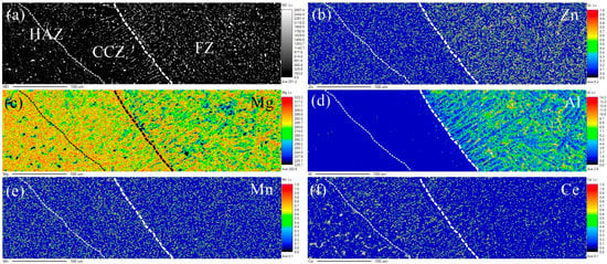 Figure 7 shows the secondary electron image and elements distribution by EPMA. It can be seen that the distribution of Mg and Mn elements is more uniform in the whole scanning area. However, there are two extremes in the distribution of the Al element. The Al elements are almost absent in the HAZ and CCZ, and there are more Al elements in the FZ. No Al elements existed in the ME21 Mg alloy, but they did appeared in the FZ. It can be observed that the grain size in CCZ was larger than that in BM-ME21, and few Al elements existed in CCZ. Therefore, the HAZ contains the CCZ.
