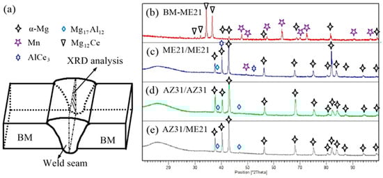 XRD spectra of ME21 and weld seam: (a) XRD phase analysis location; (b) ME21 base metal; (c) ME21/ME21; (d) AZ31/AZ31; and (e) ME21/AZ31.