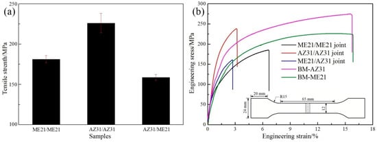 (a) Tensile strength of different joints; (b) Engineering stress–strain curve of different joints.