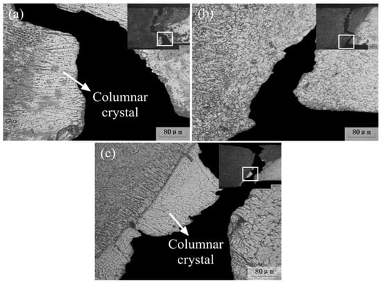 Figure 10 shows the fracture location of Mg alloys joints. As shown in Figure 10a, the ME21/ME21 joint mostly fractured at FZ, and the others fractured at CCZ, which belongs to the bottom of the weld seam. It can be seen in the magnification of CCZ that the other microstructure in the HAZ is different from that of the columnar crystal; it is easy to break at the junction of HAZ and CCZ. As shown in Figure 10b, the AZ31/AZ31 joints mostly fractured at the FZ, and partial cracks propagated along the fusion line of LPJ, which is different from the fracture mechanism of the ME21/ME21 joint. The ME21/AZ31 joint fractured at FZ and CCZ, which is similar to the fracture mechanism of the ME21/ME21 joint, as shown in Figure 10c. However, the tensile strength of the ME21/AZ31 joint is lower than that of the AZ31/AZ31 and ME21/ME21 joints, which is mainly because the Ce and Mn content in the ME21/AZ31 joint is lower than that in the ME21/ME21 joint, which is confirmed to be conducive to improving the strength of joint. The results indicate that the joint quality of dissimilar Mg alloy welding of ME21 and AZ31 is significantly lower than that of the same Mg alloy welding. Columnar crystal Ce and Mn contents are the main reason for the low tensile properties of the ME21/AZ31 joint.