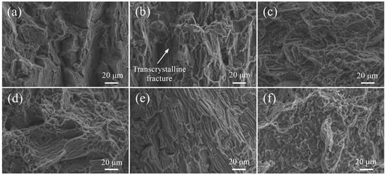The fracture surfaces of the AZ31/AZ31 joints are shown in Figure 11c,d. The fracture morphology such as cleavage steps and dimples exist in Figure 11c, while porosity is observed on that of Figure 11d. The AZ31/AZ31 welding fracture acted as a hybrid fracture mod. The ME21/AZ31 fracture in Figure 11e shows signs of a distinctly different feature to that in Figure 11f. The fracture surface of Figure 11e exhibits a tearing ridge, which possesses a definite directional character. However, the fracture surface of Figure 11f exhibits small dimples, which indicates that the seam has better toughness.
