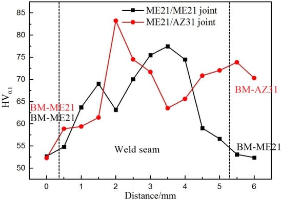 The hardness measurement values are shown in Figure 12. The microhardness of the ME21/ME21 weld seam is higher than that of ME21. Moreover, the distribution of microhardness in the cross-section presents a low–high–low trend, and the lowest microhardness is that of the BM-ME21. However, the microhardness of the ME21/AZ31 weld seam presented a low–high–low–high trend from the ME21 base metal to BM-AZ31, and the highest microhardness is in the fusion zone, which is close to the side of BM-ME21. There is a region of low microhardness between the weld center and BM-AZ31. Ce and Mn can inhibit the growth of the AZ61 alloy grain to improve the mechanical properties [28]. During the welding process, the Ce and Mn elements melted into the weld, and played a role in refining the AZ61 grain, so the microhardness of the weld seam improved remarkably. This is a reason why the microhardness close to the side of the ME21 alloys is higher than that in the other region.