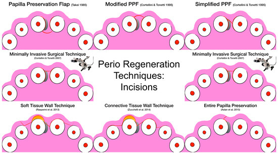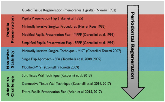 Since the birth of periodontal regeneration [17,18], the use of biomaterials has evolved along with the evolution of the surgical techniques and flap designs. Initially, the combination of extended flaps along with the utilization of barrier membranes and bone grafts was the treatment of choice [18]. Then preservation of soft tissue, with particular attention to the interdental papilla, became the focus of clinicians. The papilla preservation flap first introduced by Takei [22] and then modified by Cortellini [23,24] was developed with the aim of preserving tissue in the interdental area to favor wound healing and to minimize the risk of secondary intention healing. More recently, novel techniques like the entire papilla preservation flap (EPP) have been developed to completely preserve the interdental papilla in deep and wide intrabony defects [125,126]. Clinically it became clear that incisions had to be designed with the goal of reducing flap mobility in order to facilitate blood cloth stabilization minimizing invasiveness. These concepts were first applied in the mid-1990s by Harrel and Rees [127] and later further developed by other researchers like Cortellini with the minimally invasive surgical technique (MIST) [128] and its modification, the modified minimally invasive surgical technique (modified-MIST) [28] and Trombelli with the single flap approach (SFA) [26,27]. Traditionally, periodontal regeneration has always been limited by the anatomy of the defect. Today surgical techniques (such as the soft tissue wall technique [29]) that borrow concepts from periodontal plastic surgery have been proposed to try to overcome these limitations in the attempt to achieve supracrestal regeneration. Figure 1 summarizes the evolution of flap designs for periodontal regeneration.