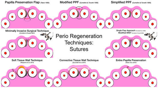 With this concept in mind, surgical techniques have evolved from large flaps to smaller ones in the attempt to preserve the soft tissues as much as possible. Better clinical results were seen with minimally invasive surgical techniques that aimed at preserving the soft tissue and limiting the mobility of the flap as much as possible. The papilla preservation flap was first introduced by Takei in 1985 [22] and later modified by Cortellini [23,24,25]. In the following decade, other surgical approaches using a single flap were developed [26,27,28], and more recently, surgical solutions that combined the concepts learned from periodontal plastic surgery and periodontal regeneration in the attempt to maximize the regenerative potential of the periodontium have been described [29]. The evolution of regenerative techniques moving from large flaps to more and more minimally invasive ones opened the possibilities for multiple biomaterials to be utilized in order to regenerate periodontal tissues [30] while limiting the possibility of using others.
