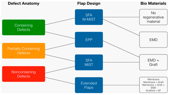 Choice of flap design and biomaterials according to defect morphology. SFA: Single flap approach, M-MIST: Modified minimally invasive surgical technique, EPP: Entire papilla preservation, MIST: Minimally invasive surgical technique.