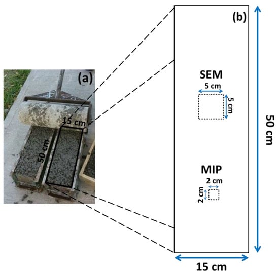 General scheme of the test samples. (a) real photo of the specimen beam and (b) areas of study for analysis of scanning electron microscope (SEM) and mercury intrusion porosimetry (MIP).