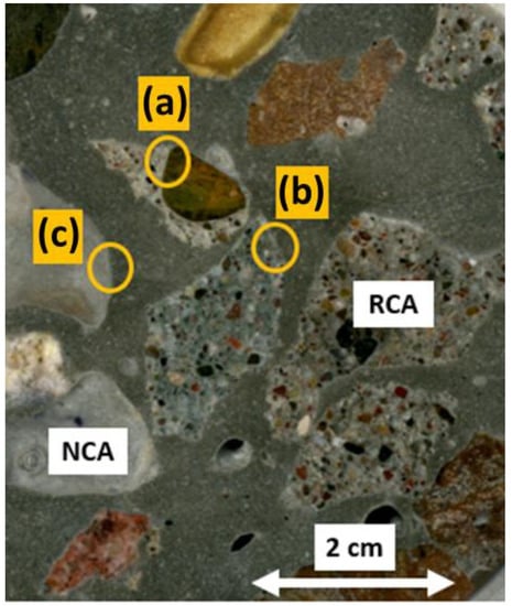 Small representative samples of the concrete beams were taken (with an exposed face of approximately 5 cm long by 5 cm wide) in order to obtain the IA-SEM images of each of the PC variables in the study. These samples were then placed within circular molds and covered with transparent epoxy resin (EpoFix Resin). They were then put in an oven for 40 min at 40 °C (catalyzer), by which time the resin had hardened and sealed the sample inside. The samples in the resin were then subjected to progressive smoothing and polishing on their exposed study face until they shone. The “areas of interest” were then chosen visually, to be studied later in the IA-SEM. As the RCA used in the PC introduced a different component to the study matrix [52,53], they were located as (a) ITZ between the new aggregate–old aggregate, (b) ITZ between new paste–old paste and (c) ITZ between new aggregate–new paste (see Figure 2); they were present in the RCA 50 SF sample. Once the “areas of interest” had been located, the samples were subjected to drying in an oven at a low temperature until they had attained a consistent weight; they were then metallized with graphite powder (obtaining a conductive surface) [54] and placed in a dryer until just before being studied in the IA-SEM.