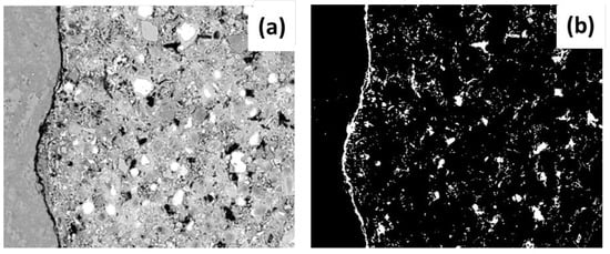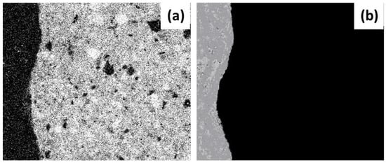 Using the same analysis procedure (operating instructions and morphological filtering), but on this occasion with the images obtained from SEM-EDS which define the basic compounds of Ca, C, Fe and Mg (incidences present in the paste), it was possible to obtain the masks that outline the paste, as shown in Figure 5. Finally, for the samples with RCA three masks were made from the aggregate and the paste in order to evaluate the porosity in different areas of the ITZ (a) new aggregate–new paste, (b) old aggregate–new paste and c) old aggregate–old paste.