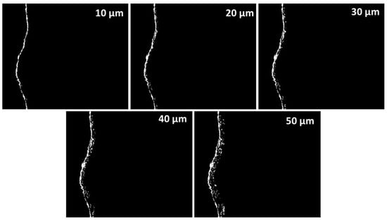 After these procedures and the image calibration, the sector in the scope of the ITZ was built (theoretical ITZ thickness located between the aggregate and paste throughout all areas). To do so, the sector previously established as the filter mask was used to establish the (theoretical) ITZ thicknesses of 10, 20, 30, 40 and 50 μm [14,27]. The image process used to achieve this was “dilation of objects”, applied to the original image of the aggregate mask and establishing the various thicknesses within the reach of the ITZ as “desired” (measured in pixels). If the pixel measurements were known it was possible to establish the thickness with the desired distance. Finally, this was overlaid onto the original binarized image. The results of the previous process that determined the sectors of ITZ can be seen in Figure 8. These were ultimately used as a mask to establish the percentage (histogram of the image) of porosity in the ITZ.