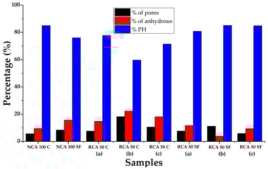 After performing an IA-SEM on the study samples, it was possible to obtain the percentages of porosity, anhydrous material and hydration products (PH) (see Figure 10). Three specifically different zones of interest were also evaluated for the RCA 50 C and RCA 50 SF samples: (a) ITZ between the new aggregate and the new paste, (b) ITZ between the old aggregate and the old paste and (c) ITZ between the old paste and the new paste.