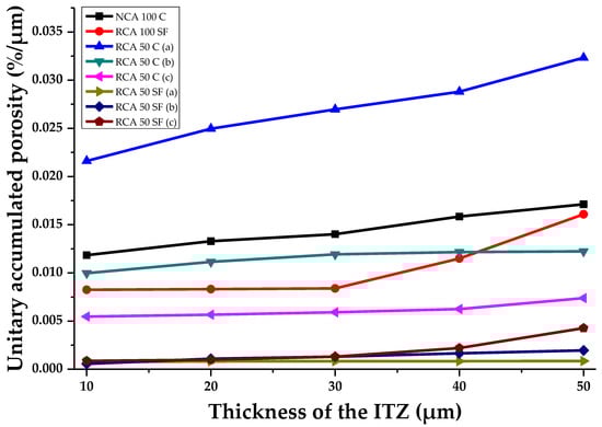Figure 11 shows the number of pores (unitary accumulated porosity, µm) determined in the study samples. It also considers the different theoretically possible thicknesses of the aggregate ITZ (ITZ of 10, 20, 30, 40 and 50 μm), which allows the transition from the porous network of the PC to be verified. It can be seen that there is a direct connection in most of the samples between the increase in the percentage of porosity and the increase in the theoretical ITZ thickness. The theoretical thickness is 10 μm, which establishes the best percentage of porosity compared with the other thicknesses evaluated; this confirms that the percentage of porosity of the ITZ decreases as its theoretical thickness increases. Another way to understand the curves is that the ITZ has finished when the curves of the samples tend toward a horizontal asymptote, with a constant—or non-increasing—percentage of porosity equal to that of the paste zone. Significantly, the three evaluated samples which had the lowest porosity in the ITZ are those with 50% of RCA and SF; this confirms that the use of SF leads to the filling effect in the ITZ porosity, making it denser and stronger. The RCA 50 C (a) sample shows the highest percentage of unitary porosity when the theoretical thickness is set at 10 μm (0.0216%/µm); at 50 μm reaches 0.032%/µm (the SEM image analyzed showed that this sample contained considerable porosity). This may have been due to the more porous nature of the RCA. Similarly, the effects of using SF were also observed in the NCA 100 SF, which had lower porosity than the NCA 100 C sample.
