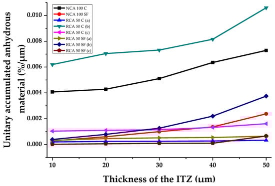 Figure 12 shows the percentage of unitary accumulated anhydrous material at different theoretical ITZ thicknesses in the PC samples studied. The trend shows a direct, rising, connection between the increase of this parameter and the increase in the theoretical ITZ thickness. It should be noted that the samples with SF have lower percentages of anhydrous material. The SF can react with the cement hydration products and form new ones, which show low percentages of non-reacting material. The RCA 50 C sample (b), has the most anhydrous material: at 10 μm an important concentration of 0.0062%/µm can be seen, reaching 0.0106%/µm when the theoretical thickness is 50 μm. Additionally, comparing NCA 100 C and NCA 100 SF, the former is shown to contain a far greater percentage of anhydrous material at all theoretical ITZ thicknesses than the latter. Therefore, to sum up, it can be said that the use of SF contributes to the formation of more hydration products in the cement paste; this material can fill pores, thereby leading to lower percentages of anhydrous material.