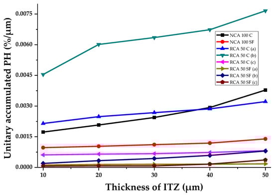 The PH (the result of subtracting the porosity and the anhydrous material from the paste) that can be detected in the ITZ studied usually has a low value, as porosity dominates in an ITZ. Figure 13 shows the percentage of unitary pH at different theoretical ITZ thicknesses (%/µm). The RCA 50 C samples (a and b) have the highest percentage of PH, which corroborates previous paragraphs. This sample showed low percentages of porosity and anhydrous material. The NCA 100 C has a high amount of PH and shows a significant increase at theoretical ITZ thicknesses of between 40 and 50 μm.