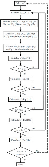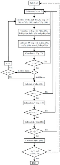 Based on the previous subsections, changes have been incorporated to the original calculation procedure of GSVATM in order to unify the analytical model for both RC solid and hollow beams under torsion. The new flowchart for the iterative calculation algorithm for GSVATM is shown in Figure 5, which is valid for both RC solid and hollow beams. Changes incorporate the correction parameters in the equations for the constitutive relationships of concrete (Equations (24) and (27) are substituted by Equations (33) and (34), respectively). In the new calculation algorithm, a RC hollow beam is initially calculated as an equivalent RC solid beam. For each value calculated for the thickness it is verified if , i.e., if the thickness of the concrete strut (or the thickness of the shear flow) is higher than the real thickness of the concrete wall. If so, it is imposed that and the calculation procedure proceeds. If not, the calculation procedure proceeds with the equivalent RC solid beam.