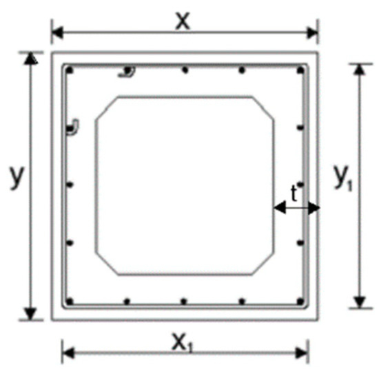 According to Jeng in 2015 [14], for a RC hollow beam with a real wall thickness , with being the value for thickness computed for each level torque with GSVATM (Equation (7)) for the equivalent RC solid beam (beam with same outer dimensions, same reinforcement and same materials), it must be imposed in the calculation procedure that the thickness of the shear flow zone occupies the entire real thickness of the wall, i.e., = With this criterion the thickness is thus limited by the real wall thickness of the RC hollow beam.