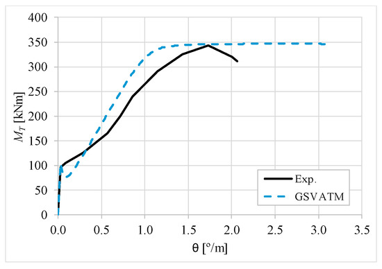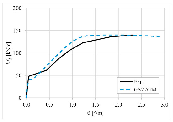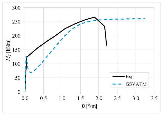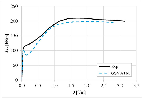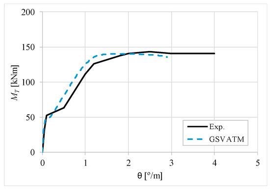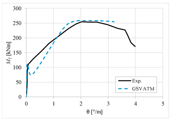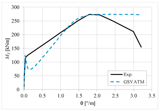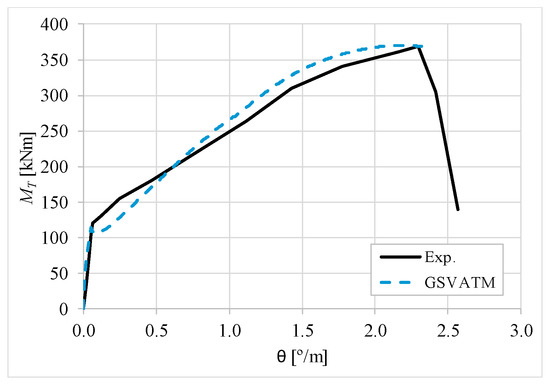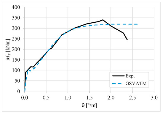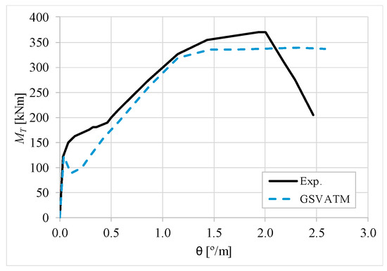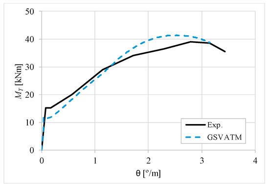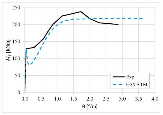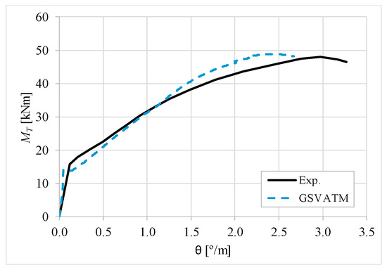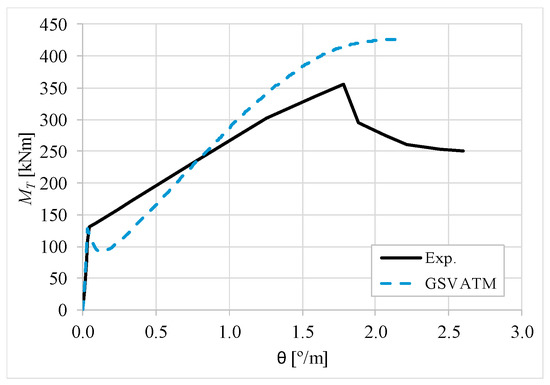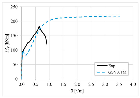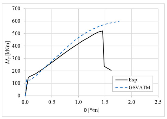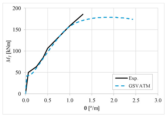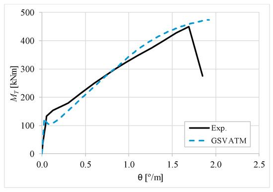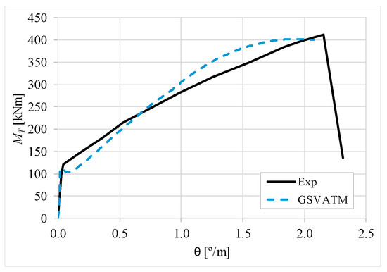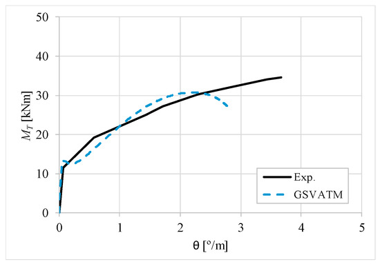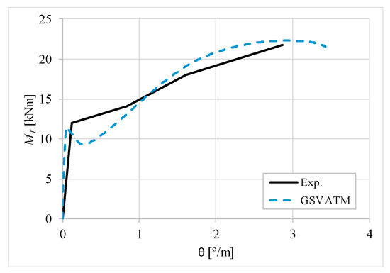 The results from Table 2 confirm that GSVATM provides very good predictions with low variability for both the cracking torque ( = 1.033 and cv = 9.46%) and the ultimate torque ( = 1.033 and cv = 7.52%). For the corresponding twists, the predictions are less good and with higher variability, mainly for the twist corresponding to the cracking torque ( = 1.601 and cv = 44.42%). The values for the experimental twist are very small in the non-cracked stage. The accuracy limitation of the rotational gauges used in the experiments can probably explain the observed results for the cracking twist. For the twist corresponding to the ultimate torque, despite the average value is good ( = 0.954), the variability is somewhat high (cv = 27.03%). It is known that the deformations in the ultimate stage are more difficult to capture correctly with analytical models due to the complexity of modelling the effect of the damage in materials. Such observation was also observed in previous studies [2,8,14]. Since the cracking and ultimate twists are not very important for the design, the worst results related with these parameters can be considered less important.