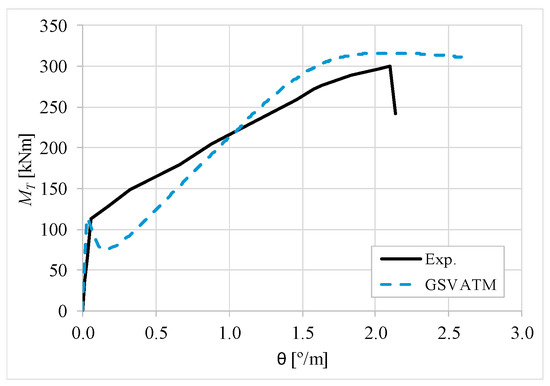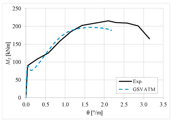 Figure 7, Figure 8, Figure 9, Figure 10, Figure 11, Figure 12, Figure 13, Figure 14, Figure 15, Figure 16, Figure 17, Figure 18, Figure 19, Figure 20, Figure 21, Figure 22, Figure 23, Figure 24, Figure 25, Figure 26, Figure 27, Figure 28, Figure 29, Figure 30, Figure 31, Figure 32, Figure 33, Figure 34, Figure 35 and Figure 36 present, for each reference beams, the experimental and theoretical −θ curves. With few exceptions, it can be stated that Figure 7, Figure 8, Figure 9, Figure 10, Figure 11, Figure 12, Figure 13, Figure 14, Figure 15, Figure 16, Figure 17, Figure 18, Figure 19, Figure 20, Figure 21, Figure 22, Figure 23, Figure 24, Figure 25, Figure 26, Figure 27, Figure 28, Figure 29, Figure 30, Figure 31, Figure 32, Figure 33, Figure 34, Figure 35 and Figure 36 show good agreement between the experimental and theoretical −θ curves. The theoretical curves capture well the behavior of the reference beams for all loading levels. Both cracking torque and ultimate (maximum) torque show also good agreement and with small variability.