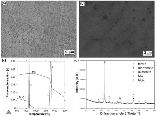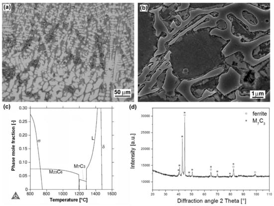 Characterization of “RD 571” hardfacing: overall microstructure visualized by LOM (a); detailed microstructure visualized by SEM (b); thermodynamic calculation of equilibrium phase composition depending on temperature (c); XRD-pattern representing experimentally determined phase composition (d).