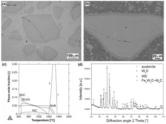 Figure 3a shows the light-optical micrograph of “cermet-type” microstructure of “RD 571” hardfacing produced by autogenous welding using a cored electrode with W2C filler powder. Due to the “RD 571” hardfacing chemical composition (Table 2), including extremely high nickel content (15 wt.% Ni), the matrix phase of this hardfacing is primarily formed of austenitic solid solution. The dense occurrence of blocky tungsten carbide particles in the microstructure is reasonably related to the electrode filler composition (60 wt.% W2C). Thermally-induced cracks are clearly visible in the microstructure. They are presumably caused by volume changes of individual microstructural constituents during the solidification [26] and their formation may be a result of high cooling rate and a difference in thermal expansion coefficients of the carbide and the matrix [27]. Thanks to partial melting of W2C particle/matrix interfaces (seen more clearly on SEM image in Figure 3b), an original matrix solid solution is getting enriched by a certain amount of dissolved tungsten and carbon. This effect gives rise to the formation of additional precipitate phases, such as WC and M6C carbides which were indeed indicated by both thermodynamic calculation (Figure 3c) and XRD measurement (Figure 3d). Thermodynamic calculation was performed for estimated modification of the hardfacing matrix composition containing up to 15 wt.% W and 0.6 wt.% C, taking into account the considered W2C partial melting effects. The presence of thermodynamically predicted boride phase has not been experimentally evidenced by performed XRD measurement.