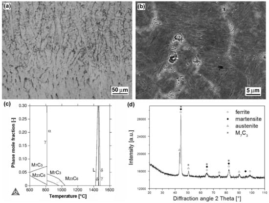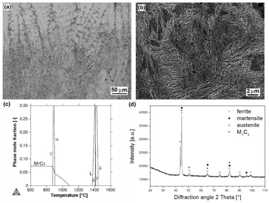 Figure 5a shows light-optical micrograph of dendritic microstructure of “E DUR 600” hardfacing produced by MMA welding method. Thanks to its chemical composition (Table 2), including high chromium, carbon, and tungsten content (8.5 wt.% Cr, 0.5 wt.% C, 0.5 wt.% W), the microstructure is very similar to the microstructure of previous “LNM 420FM” hardfacing. The present microstructure (Figure 5a,b) was also formed by solidification through high-temperature δ-ferrite region and then it transformed to austenite phase (Figure 5c). It also holds that due to the presence of δ-ferrite and austenite in high temperature range and high cooling rate during the hardfacing production, its final microstructure is formed of ferritic/martensitic matrix. The thermodynamic calculation also shows secondary phase precipitation of M7C3 and M23C6 chromium carbides. A corresponding XRD pattern of the hardfacing is shown in Figure 5d. It has indeed indicated the presence of ferritic/martensitic matrix with M7C3 type carbides and some amount of retained austenite.