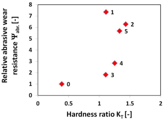 As expected, the highest weight loss, i.e., the lowest abrasive wear resistance was exhibited by the 16MnCr5 grade reference steel without hardfacing. On the other hand, all the used hardfacings exhibited lower weight loss compared to the reference steel. In order to estimate eventual correlation between abrasive wear resistance and hardness characteristics, Figure 9 shows the graphical dependence of relative abrasive wear resistance on the hardness ratio (i.e., the ratio of the tested material hardness to the used SiO2 abradant hardness).