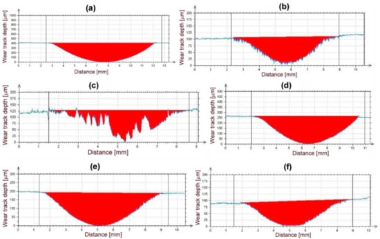 Figure 10 shows cross-sectional profiles of wear tracks generated on the surfaces of individual samples after the performed abrasion wear tests.