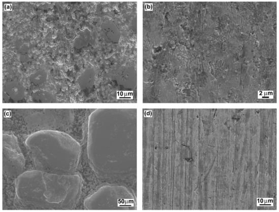 In Figure 12, typical wear mechanisms are shown for the investigated hardfacings exhibiting significant differences in their microstructural features influencing the resulting abrasive wear resistance. Figure 12a shows the wear track topography for the “E520 RB” hardfacing with the highest abrasive wear resistance. As expected, the observed wear track characteristics do not indicate any severe wear damage mechanisms. As mentioned earlier, this behavior can likely be related to the beneficial “interlocking” effect of the “ledeburite-type” eutectic microstructure (Figure 2b). The wear track topographies of the “Weartrode 62” and “RD 571” hardfacings with slightly worse abrasive wear resistance than the “E520 RB” hardfacing are shown in Figure 12b,c, respectively. From the observation of the wear track topography of the “Weartrode 62” hardfacing (Figure 12b), it can be clearly indicated that abrasive wear mechanisms are limited to some isolated cutting and delamination effects in the vicinity of the precipitate particles. On the other hand, in Figure 12c, showing the wear track surface of the “RD 571” hardfacing, the acting wear mechanisms are related to intensive plastic deformation and preferential removal of the austenitic steel matrix accompanied by retarded surface abrasion of bulky tungsten carbide particles leading to the overall wear suppression. Finally, Figure 12d shows the wear track topography of the “LNM 420FM” hardfacing with the lowest abrasive wear resistance. The wear track pattern clearly indicates the wear mechanism to be pronounced cutting which is generally considered to be the most severe abrasion wear mechanism. It is generally accepted that the cutting mechanism results in the most intensive removal of the abraded material from its surface. Thus, the observed cutting mechanism correlates well with the lowest abrasive wear resistance of the “LNM 420FM” hardfacing.