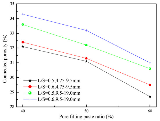 The connected porosity and permeability of porous concrete are correlated. Figure 1 shows the relationship between the connected porosity and percentage of pore filling paste ratio of novel, environmentally friendly GGBFS-based porous concrete. By investigating the porous concrete of two different particle sizes, the present study found that the connected porosity of porous concrete with a particle size of 9.5–19.0 mm was higher than that with a particle size of 4.75–9.5 mm. This was because the gap between the aggregates in the first porous concrete was larger than that between the aggregates in the second porous concrete. Therefore, when the percentage of pore filling paste ratio was kept constant, the porous concrete with a particle size of 9.5–19.0 mm demonstrated a connected porosity higher than that with a particle size of 4.75–9.5 mm. An increase in the percentage of pore filling paste ratio decreased the connected porosity of the porous concrete, which was because the rise in the percentage of pore filling paste ratio resulted in the pores behind being filled by alkali activated materials.