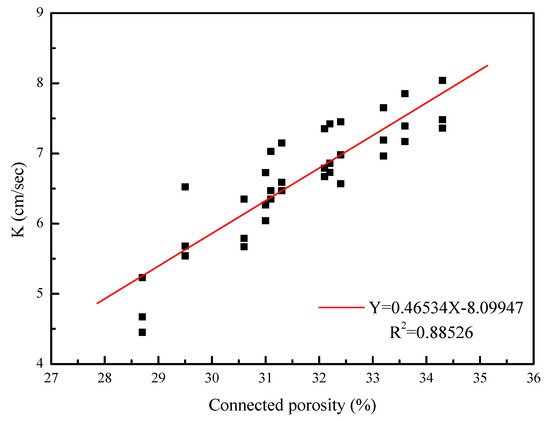 Figure 2 shows the relationship between the connected porosity and permeability, in which permeability was positively correlated with connected porosity for both aforementioned types of porous concrete. Under identical connected porosity conditions, porous concrete with a smaller aggregate particle size had a smaller connected pore sectional area and a more curved permeable path inside the specimen. Conversely, porous concrete with a larger aggregate particle size had a larger connected pore sectional area and a straighter permeable path inside the specimen. The permeability coefficient increases with an increase in porosity. When the permeability increased to 7.48 cm/s, the porosity was more than 34%, and when the porosity was about 4.67 cm/s, the porosity increased to 28%. The equation is equal to Y = 0.46534X − 8.09947, while the porosity and permeability coefficient is proportional to the values shown in Figure 2. Porosity is an important factor affecting the permeability coefficient.