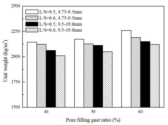 The novel environmentally friendly GGBFS-based porous concrete had a unit weight of approximately 2011–2260 kg/m3 (Figure 3), which shows the relationship between unit weight and pore filling paste ratio percentage. For porous concrete of a single particle size, the unit weight was positively correlated with percentage of pore filling paste ratio and negatively correlated with liquid-to-solid ratio (L/S). In addition, when the liquid-to-solid ratio was held constant, an increase in aggregate particle size decreased the porous concrete’s specific surface area, which decreased the unit weight. This was because the BOF had a specific gravity of approximately 3.30 greater than the approximately 2.65 specific gravity of the natural aggregate. Porous concrete made from the GGBFS-based alkali activated slag cement had a unit weight greater than that of general porous concrete (1400 kg/m3–1900 kg/m3).