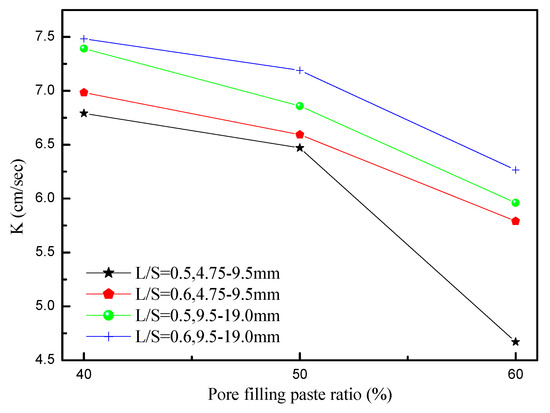 Figure 5 shows the effects of the liquid-to-solid ratio and particle size on permeability. The permeability of porous concrete with a particle size of 9.5–19.0 mm was greater than that of porous concrete with a particle size of 4.75–19.0 mm. In particular, at a liquid-to-solid ratio of 0.6 and a pore filling paste ratio percentage of 40%, the former displayed a permeability of 7.48 cm/s, which was the largest among all particle combinations. By contrast, at a liquid-to-solid ratio of 0.5 and a pore filling paste ratio percentage of 60%, the latter produced a permeability of 4.67 cm/s, which was the smallest among all particle combinations. For both types of porous concrete, permeability decreased as the amount of slurry increased. This result shows that the increase in slurry filled up a higher ratio of permeable paths in the specimen, causing the permeability to drop. In addition, the permeability of the porous concrete increased as the liquid-to-solid ratio increased, because, at low liquid-to-solid ratio, the slurry had higher viscosity and completely wrapped the aggregate particles. As the specimen hardened, the slurry-wrapped aggregates formed complete particles that remained in point-to-point contact with each other. This structure made the pores into permeable paths. Conversely, at high liquid-to-solid ratio, the slurry wrapped the aggregate particles but most failed to remain in point-to-point contact with each other because of high fluidity. As a result, permeable paths were less likely to form and permeability was lowered.