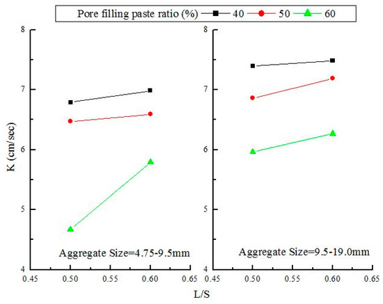 The permeability coefficient is a crucial indicator of the permeability of concrete. According to the Japan Concrete Road Association, Tokyo, Japan (1996), porous concrete must feature a permeability greater than 0.01 cm/s. Figure 4 shows the relationship between the permeability and pore filling paste ratio percentage over 28 d, which showed that porous concrete with a particle size of 9.5–19.0 mm displayed a higher permeability than that with a particle size of 4.75–9.5 mm. This was because the former created larger pores than the latter during the stacking process. The permeability of the two types of porous concrete ranged between 4.67 and 7.48 cm/s during the 28 d. At a liquid-to-solid ratio of 0.5 and a pore filling paste ratio percentage of 60%, porous concrete with a particle size of 4.75–9.5 mm produced a permeability of 4.67cm/s. This low permeability was a result of the particle size being smaller and more pores between the aggregates being filled. At a liquid-to-solid ratio of 0.6 and a percentage of pore filling paste ratio of 40%, porous concrete with a particle size of 9.5–19.0 mm showed a maximum permeability of 7.48 cm/s. In addition, when the pore filling paste ratio percentage was held constant, pores created by porous concrete (with a particle size of 4.75–9.5 mm) during the stacking process were regularly and completely filled by the slurry, causing the permeable path to fill up and the permeability to drop. An increase in aggregate particle size increased permeability. When the pore filling paste ratio increased, the number of pores that remained unfilled decreased, which made the pores highly sensitive to the slurry and prone to being completely filled by the slurry. This process then caused the permeability to decline.