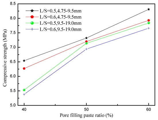 The compressive strength of the porous concrete measured in the 28 d was the most critical indicator of its mechanical properties. In general, typical porous concrete has a compressive strength of 2.8–28 MPa. Because porous concrete has many internal pores, its compressive strength is lower than that of general concrete. In this study, the compressive strength of the porous concrete in the 28 d was 5.38–8.31 MPa, which satisfied general porous concrete intensity requirements. Figure 6 shows the effect of the pore filling paste ratio percentage on compressive strength. Porous concrete with a particle size of 4.75–9.5 mm exhibited a stronger compressive strength than that with a particle size of 9.5–19.0 mm, whereas the latter displayed a bigger porosity than that of the former, showing that an increase in porosity decreased compressive strength. At identical aggregate particle sizes and liquid-to-solid ratio, compressive strength increased as the pore filling paste ratio percentage increased. Pore size was determined by the pore filling paste ratio percentage: when the pore filling paste ratio percentage increased, more aggregate pores were filled, resulting in a stronger intensity.
