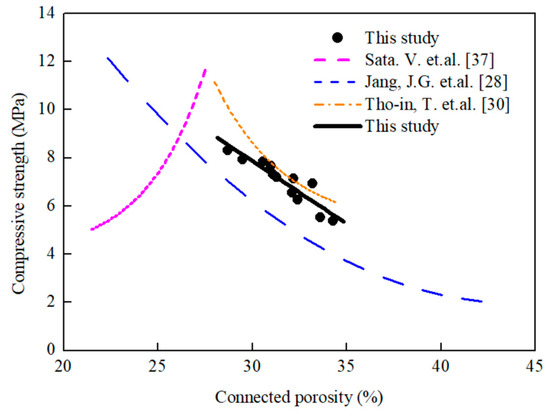 Figure 7 shows the relationship between compressive strength and connected porosity. In the study of Jang et al. [28], connected porosity was 24.1%–0.5%, and maximum compressive strength was 9.5 MPa. In the study, compressive strength was 5.4–11.4 MPa, the maximum compressive strength was 11.4 MPa, and the connected porosity was 28.7 [30]. In the Sata et al. [37] study, when the porosity was 21.7%, the compressive strength was 4 MPa, the maximum pore size was 26.9%, and the compressive strength was 10 MPa. In this study, the GGBFS-based porous concrete had a connected porosity of 28.4%–34.3% and a compressive strength of 5.38–8.31 MPa. These results are similar to those presented in [28]. That is, the porosities were relatively higher, the compressive strengths were all lower than 10 MPa, and when the connected porosity increased, compressive strength decreased.