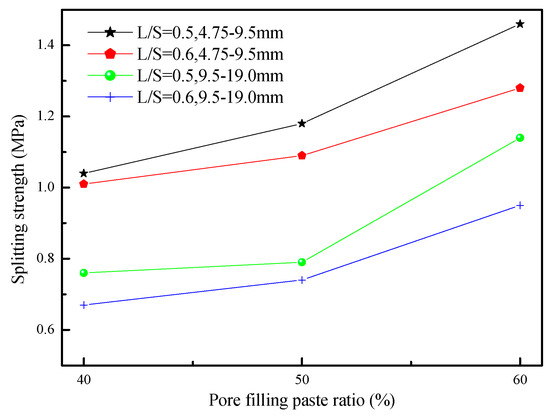 Figure 8 shows the relationship between the splitting strength and pore filling paste ratio of porous concretes. When the pore filling paste ratio was 40%, the splitting strength was 0.76 MPa; the pore filling paste ratio was 60%, and maximum splitting strength was 1.46 MPa. This result shows that the pore filling paste ratio was positively correlated with splitting strength. In addition, the maximum and minimum splitting strengths also occur in the minimum and maximum particle size, which shows that the development of splitting strength is inversely proportional to the size of the particle. When the pore filling paste ratio is 60%, and particle size is 4.75–9.5 mm, then the splitting strength is the largest. The highest splitting strength is 1/9 of the compressive strength.