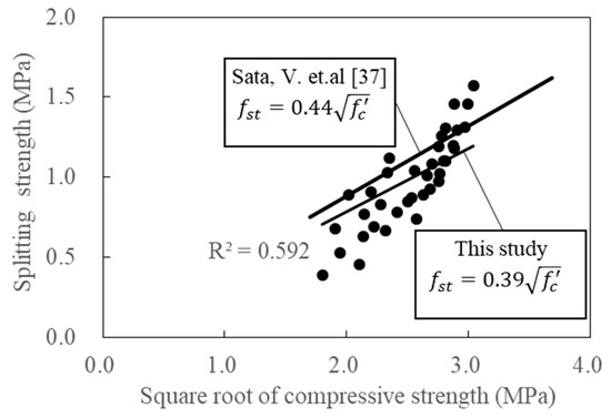 Figure 9 shows the relationship between splitting strength and the square root of compressive strength. The results were subsequently compared with those obtained by Sata et al. [37], from which Equation (1) was derived. This equation shows that an increase in compressive strength increased splitting strength. However, the splitting strengths of the GGBFS-based porous concrete (attained via linear regression calculations) obtained in this study were lower than those found in the study of Sata et al. [37].