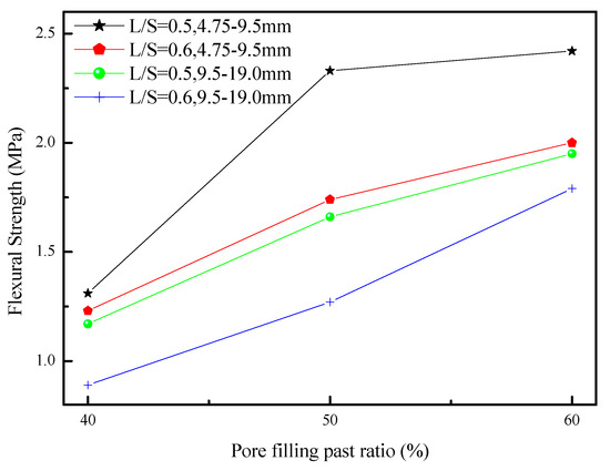 Figure 10 shows the relationship between the flexural strength and pore filling paste ratio of porous concretes. When the pore filling paste ratio increased from 40% to 60%, the flexural strength of the GGBFS-based porous concrete increased, whereas an increase in the liquid-to-solid ratio decreased the flexural strength of the GGBFS-based porous concrete. This was because an increase in the liquid-to-solid ratio diluted the alkali activator solution, which lowered solution activity. By contrast, an increase in pore filling paste ratio increased the overall flexural strength of the GGBFS-based porous concrete and solved the problems that existed between the aggregates and slurry porosities. The trend of flexural strength was similar to that of the compressive strength.