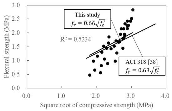 The linear regression of the compressive strength at the flexural strength and the radish ratio of 0.5 and 0.6 is shown at 7 days, 28 days, and 56 days of age in Figure 11. The compressive and splitting strengths of the furnace slag-based porous concrete were compared with the ACI 318 [38], from which Equation (2) was derived, showing that compressive strength was positively correlated with flexural strength.