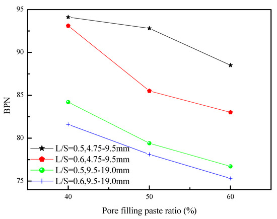 The British pendulum tester can be used as an indicator of the slip resistance of porous concrete. A low BPN indicates poor slip resistance. Figure 12 shows the relationship between BPN and the pore filling paste ratio. Table 4 shows the recommended minimum BPN values obtained from a study report of Wessex Engineering Ltd. In the present study, the BPN values were 75.31–94.11 for all component ratios used, satisfying the aforementioned BPN value requirement. When the pore filling paste ratio increased, the BPN decreased. This may have been caused by the forming of a smoother surface as the slurry increased. The optimal BPN value was achieved when the pore filling paste ratio and particle size were 40% and 4.75–9.5 mm, respectively. Moreover, the porous concrete made using a particle size of 4.75–9.5 mm was larger than that made using a particle size of 9.5–19.0 mm. This may have been caused by the former having a rougher surface that subsequently increased the level of friction. This result shows that an increase in aggregate particle size decreased BPN.