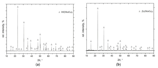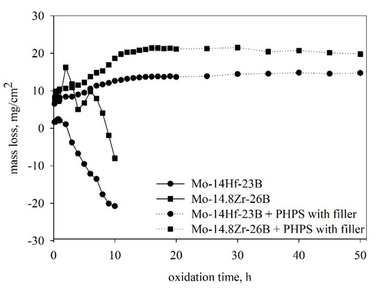 At the first stage (during the first 2 h), a mass gain in both alloys was observed. This oxidation step corresponds to the formation of MoO3 and MoO2 oxides [17]. A further oxygen penetration into the samples and evaporation of MoO3 led to a rapid oxidation of the entire bulk of the alloys. The mass loss after 10 h of exposure in air is −21.6 mg/cm2 for the Mo-14Hf-23B and −9.8 mg/cm2 for the Mo-14.8Zr-26B alloy. After 10 h, the samples were broken due to the formation of cracks in the oxidation products. XRD (X-ray diffraction) analyses applied to the oxide surface showed the existence of Hf(MoO4)2 and Zr(MoO4)2 ternary oxides (Figure 2). A boron-containing oxide was not found by XRD investigations, which might be due to a possible amorphous structure of such oxides.