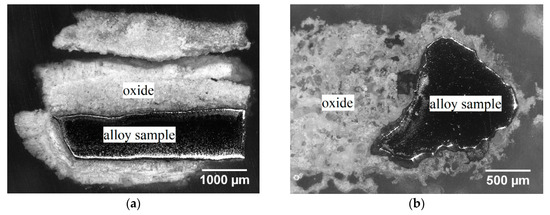 Optical microscope images of the cross-section of (a) Mo-14Hf-23B and (b) Mo-14.8Zr-26B alloys after cyclic oxidation in air at 800 °C for 10 h.