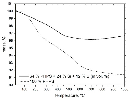 Mass change curves of crosslinked plain PHPS and PHPS + (24Si + 12 B) volume% of fillers (balance to 100 vol.% PHPS) after pyrolysis in N2 atmosphere.