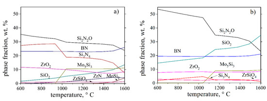 Calculated equilibrium phase amounts in the temperature range from 600 °C to 1600 °C of (a) Si-N2-H2-O2-Mo-Zr-B (0.238-0.596-0.193-0.050-0.082-0.019-0.036) mol and (b) Si-N2-H2-O2-Mo-Zr-B (0.238-0.596-0.193-0.100-0.082-0.019-0.036) mol.