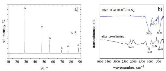 In the FT-IR spectra, the crosslinked absorption bands were detected corresponding to Si–H stretching vibration at 2120 cm−1, Si–N vibrations at 840–1020 cm−1 and Si–O vibrations at 1063 cm−1 (stretching mode region) and at 456 cm−1 (rocking mode region) [26,27,28], (Figure 6b). This demonstrates that at the stage of crosslinking, oxygen atoms particularly replaced nitrogen atoms resulting in silicon oxynitride and silicon oxide amorphous ceramic. After pyrolysis in nitrogen at 1000 °C, the Si–H absorption band completely disappears because of the dehydrogenation reaction, and the only absorption peaks of Si–O bonds were detected in the composite. The Si–O vibrational peak at 1063 cm−1 was found to have a higher intensity compared to that of the crosslinked material. From this, we conclude a higher number of Si–O–Si units within the pyrolyzed material. The incorporation of nitrogen into the material cannot be excluded nor confirmed. Since no other phase than elemental silicon was found by XRD, the SiO2 phase is supposed to be an amorphous/glassy phase.