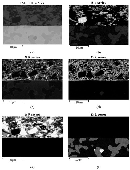 In another set of experiments, real coatings on Mo-14.8Zr-23B and on Mo-14.8Zr-26B were characterized after pyrolysis in nitrogen at 1000 °C. Scanning electron microscope (SEM) analyses and EDS element mapping results are shown exemplarily for the Mo-14.8Zr-23B sample in Figure 7.