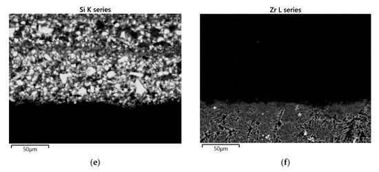 Even after 50 h of oxidation testing in air at 800 °C, the distribution of Si, N, B and O in the oxidized coating layers are retained (EDS mapping results, Figure 8), and no hints to the presence of Zr or Mo oxides was found in the coating layers. This points out that no oxidation processes occur after the alloy samples were coated, crosslinked, pyrolyzed and exposed to air. However, there was a slight increase of the coating thickness after high temperature exposure to air; coating thicknesses increased to 460 µm, and 480 µm for Mo-14Hf-23B and Mo-14.8Zr-26B alloy, respectively. This is caused by a SiO2 surface layer formation resulting from the chemical reaction of free Si with oxygen, see Figure 8.