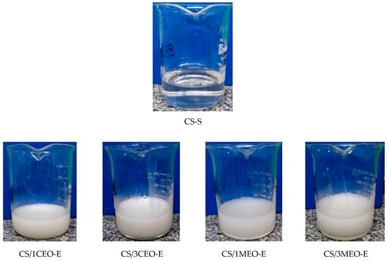 The appearance of the chitosan solution (CS-S) and chitosan/clove and melaleuca essential oils emulsions (CS/1CEO-E, CS/3CEO-E, CS/1MEO-E, and CS/3MEO-E) are shown in Figure 1. The chitosan used in this study, with an impurities content of less than 1%, presented good solubility in lactic acid and an excellent optical property of transparency in visible light (colorless) and the chitosan/essential oils emulsions had translucent aspect with cloudy milky appearance, suggesting that droplet radius is possibly higher than to 100 nm. According to Mason, et al. [], the nanoemulsions presented visual aspect different from macroemulsions. This behavior is due to the radius of the droplets being much smaller than the wavelength in the visible range, presenting optical transparency for this case. On the other hand, nanoemulsions with droplets of approximately 100 nm, have a hazy appearance and, above this value, the nanoemulsions have a milky appearance (white) due to the multiple scattering of the light beam in the visible region. In this case, it is suggested that both the chitosan molecules and the oil droplets, due to their lack of affinity, showed phase separation in particular, when a volume from 3% from oil was used in the formulations [,,].